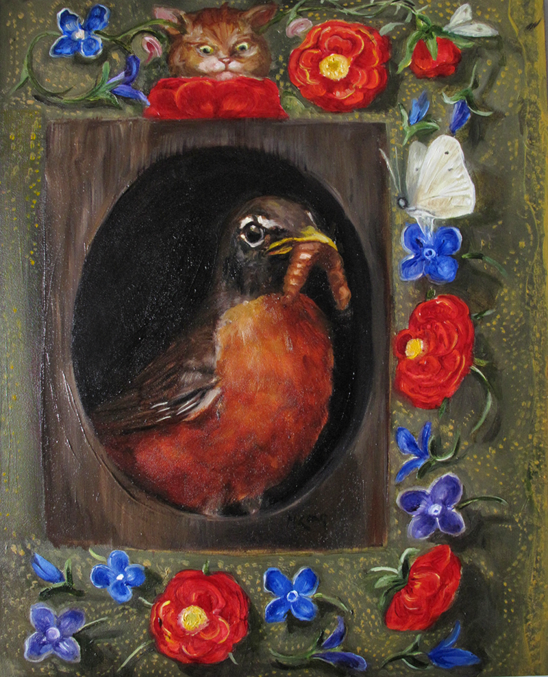 Such a cold winter, gives way to a Spring flush with Robins and worms. A well deserved treat! This painting will be available soon on eBay at margotkingfineart . Thanks for looking
